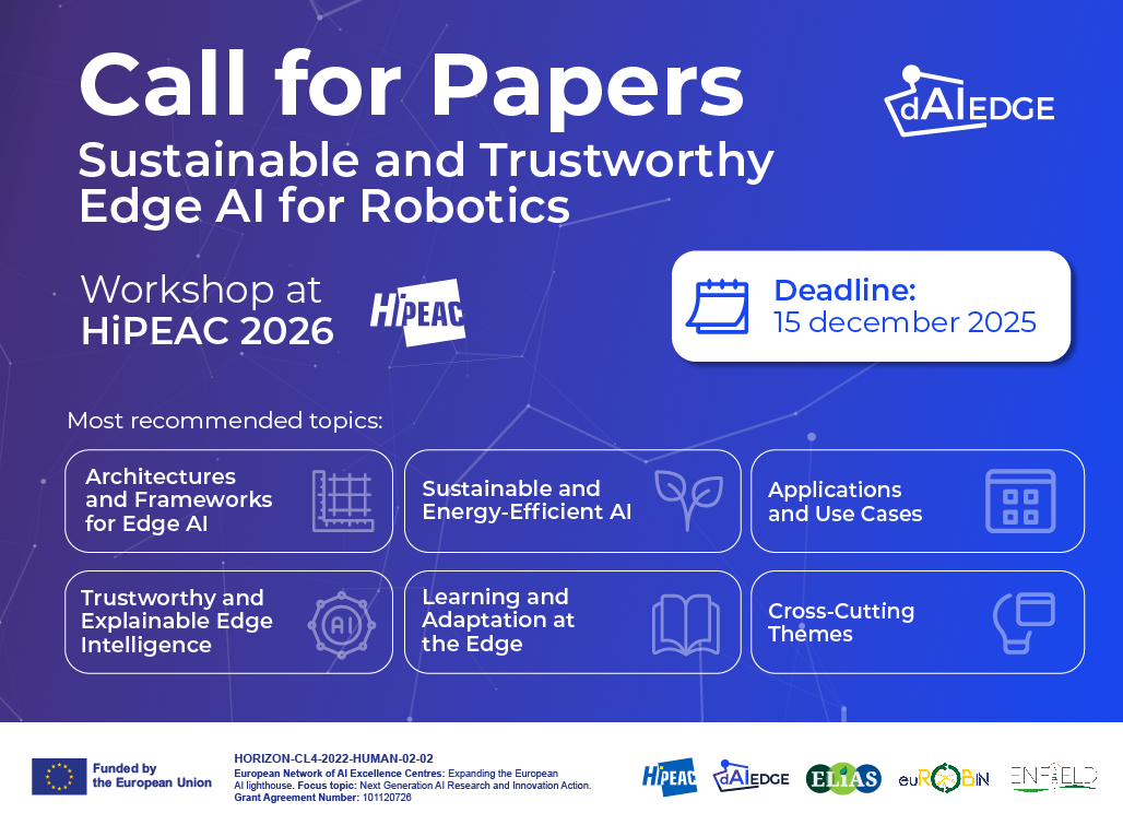 The submission deadline is 15 December 2025, with author notification on 23 December, ahead of our meeting on 28 January 2026 at HiPEAC. The workshop is organised in collaboration with four European Networks of Excellence: dAIEDGE, euROBIN, ELIAS and ENFIELD.